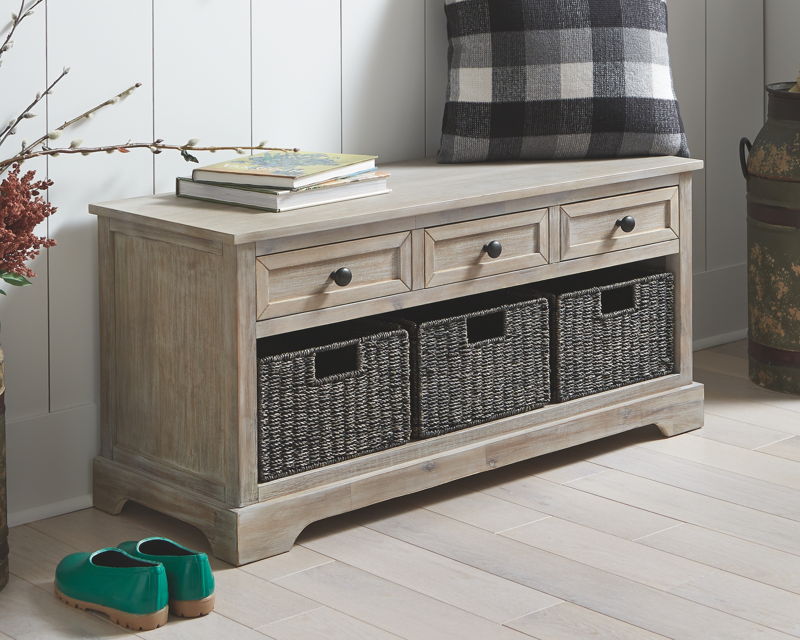 This wonderfully weathered storage bench makes what’s old fresh and new. Packed with possibilities, it’s sure to be a welcome addition everywhere from the entryway to the bedroom, home office, kitchen or mudroom. Quality construction includes three smooth-gliding drawers and a trio of woven baskets that make handy catchalls.
