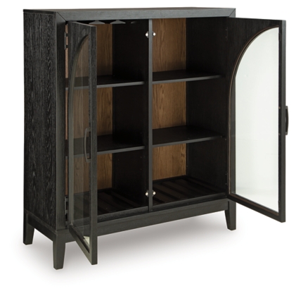 If your love of entertaining is only surpassed by your love of sleek, versatile style, this bar cabinet expertly suits your needs. Racks for wine bottles and glasses neatly store necessities for a pour of vino. Adjustable shelves comfortably hold additional bottles, dishware or drink-making accessories. For added flexibility, the cabinet’s black and natural brown finishes effortlessly pair with your home’s existing aesthetic. Doors with softly curved glass inserts allow this chic piece to double as a display space.