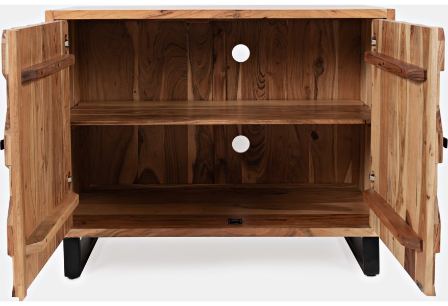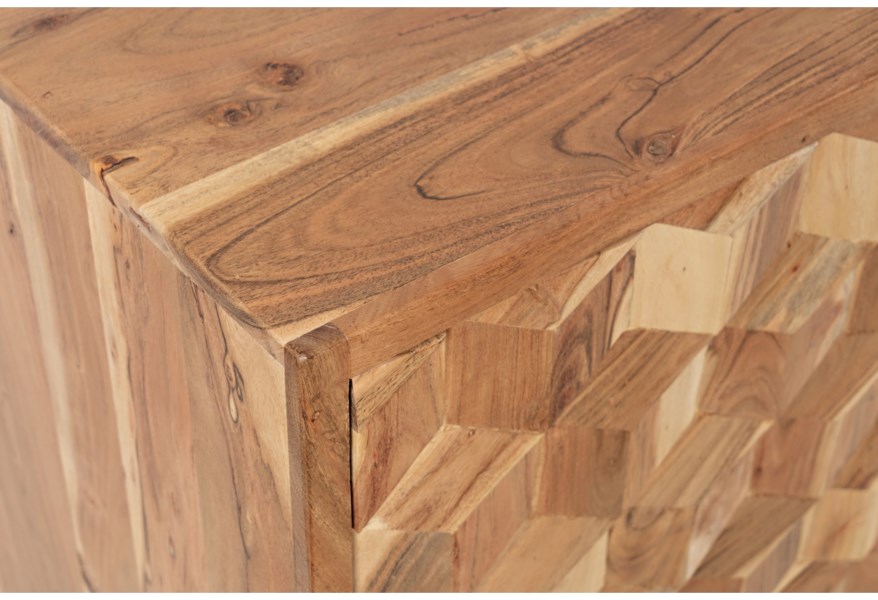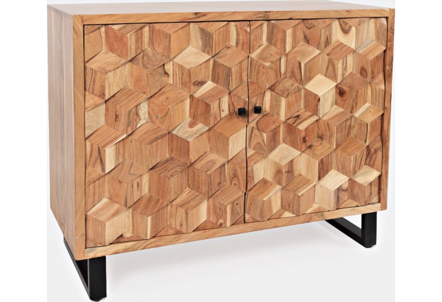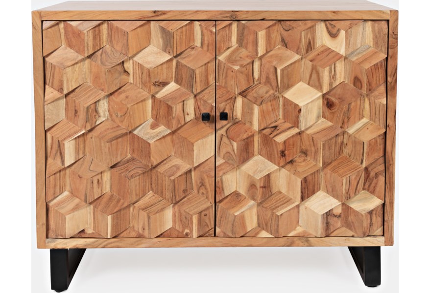 This 2 door accent cabinet has been intricately designed by hand. Each shape was hand selected and pieced together to achieve the eye-catching, multi-dimensional pattern. Every finished piece is uniquely different, creating a one of a kind look that will be THE statement piece in your home.