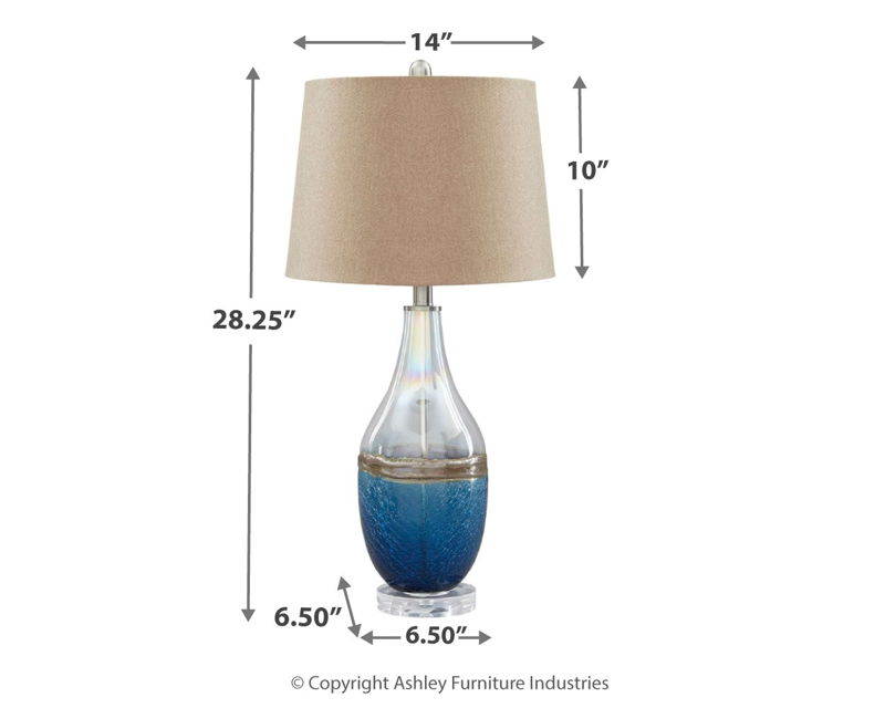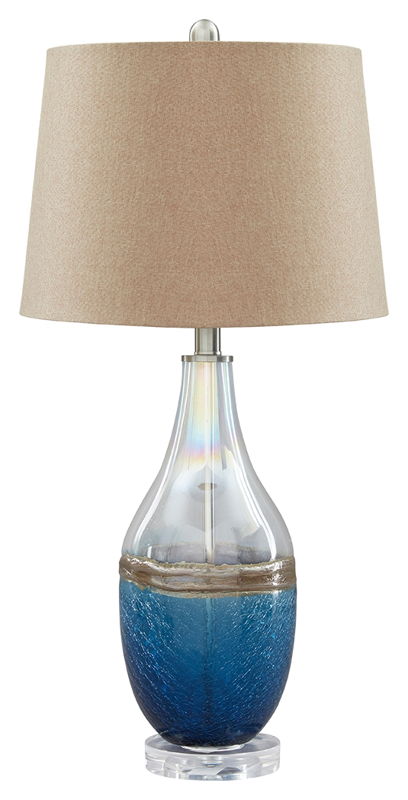 This table lamp embraces artful nautical living. Elements of the coast are reflected in the sea glass-inspired base. Textural ocean blue and sandy brown banding are reminiscent of where water meets land. At the right angle, light reflects a rainbow through the clear portion of the base. Tan drum shade completes the relaxing appeal.