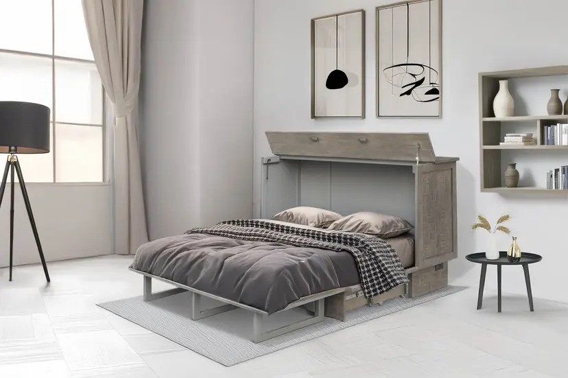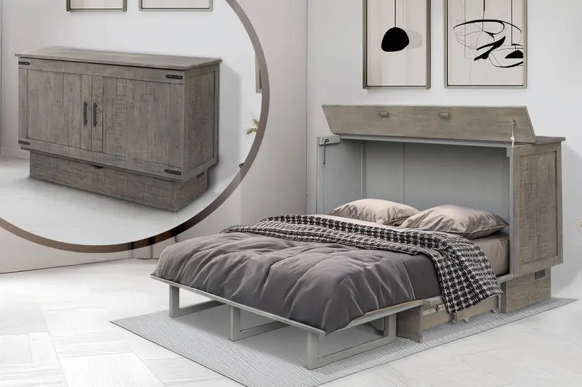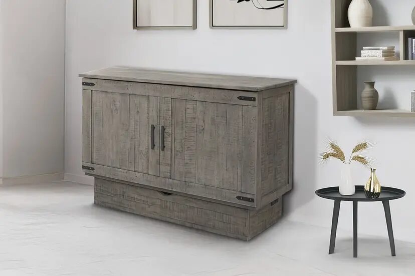 The Medison Sleep Cabinet is unique in design and hand-built for function and style. This sleep cabinet offers extra sleeping space in a compact package, perfect in your bedroom or guest room. Finished in a distressed brown tone, this sleep cabinet features rustic paneling adding to its striking look. A convenient cut-out handle allows for easy pull-out of the queen size mattress.