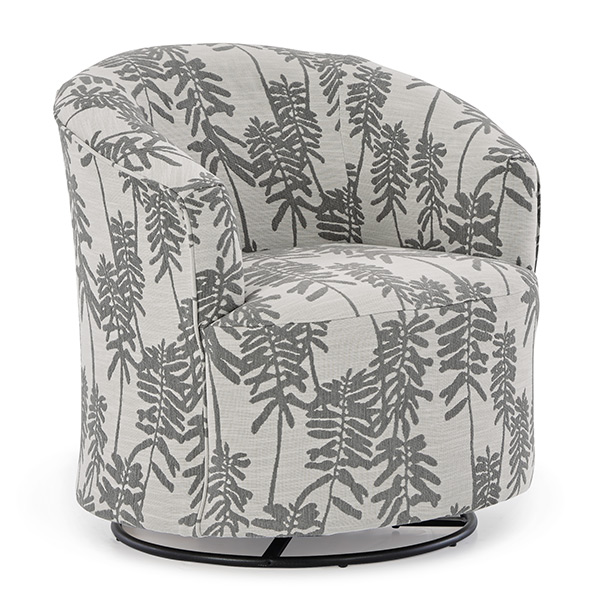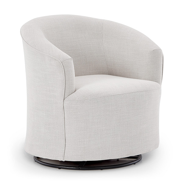 Simplicity describes this Kahlari swivel glider chair. The tall back curves around and flows seamlessly to the handcrafted cording and accents. The smooth, tight seat with extra tall deck sits atop the low profile swivel base. The whisper smooth glide action combined with the 360-degree swivel action provides a versatile and functional accent piece. Over 700 fabrics are available to make it your own. Expertly crafted in the USA.