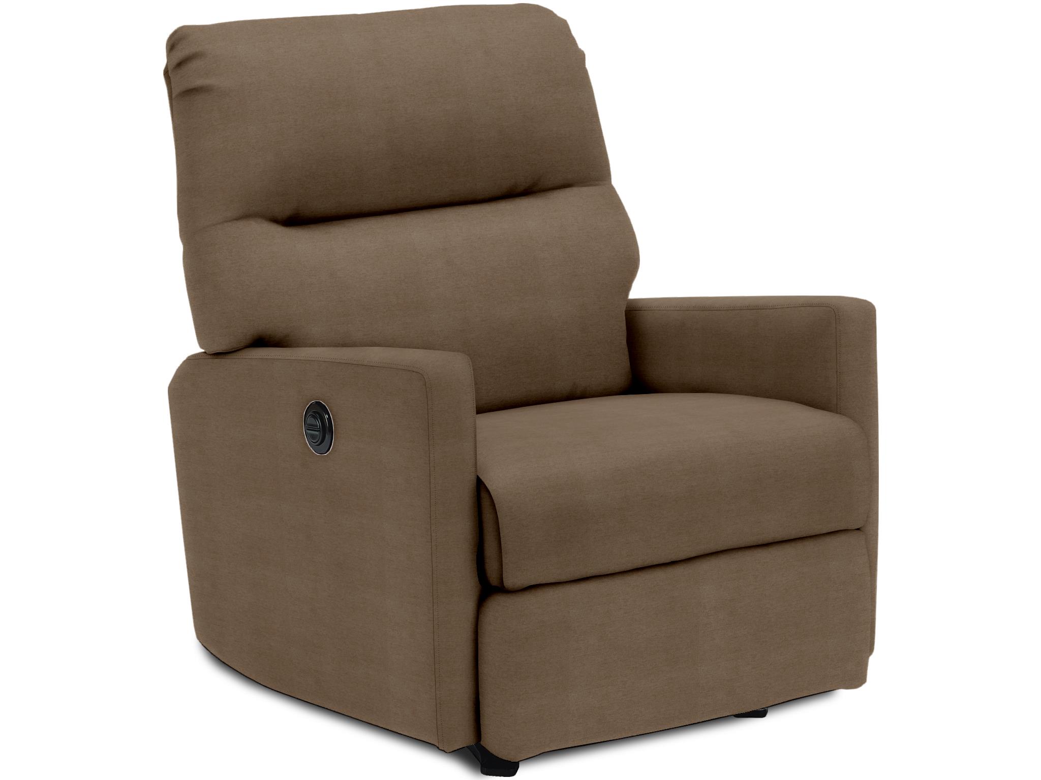 Complementing the sophisticated style of this small-scaled recliner is the generous amounts of pillow fiber cushioning in the back. The squared off arms feature lightly padded arms to maintain the sleek look. The simple silhouette is available in numerous comfort options that will allow you to stay sitting for hours on end in bliss. Made in the USA by skilled craftsmen.