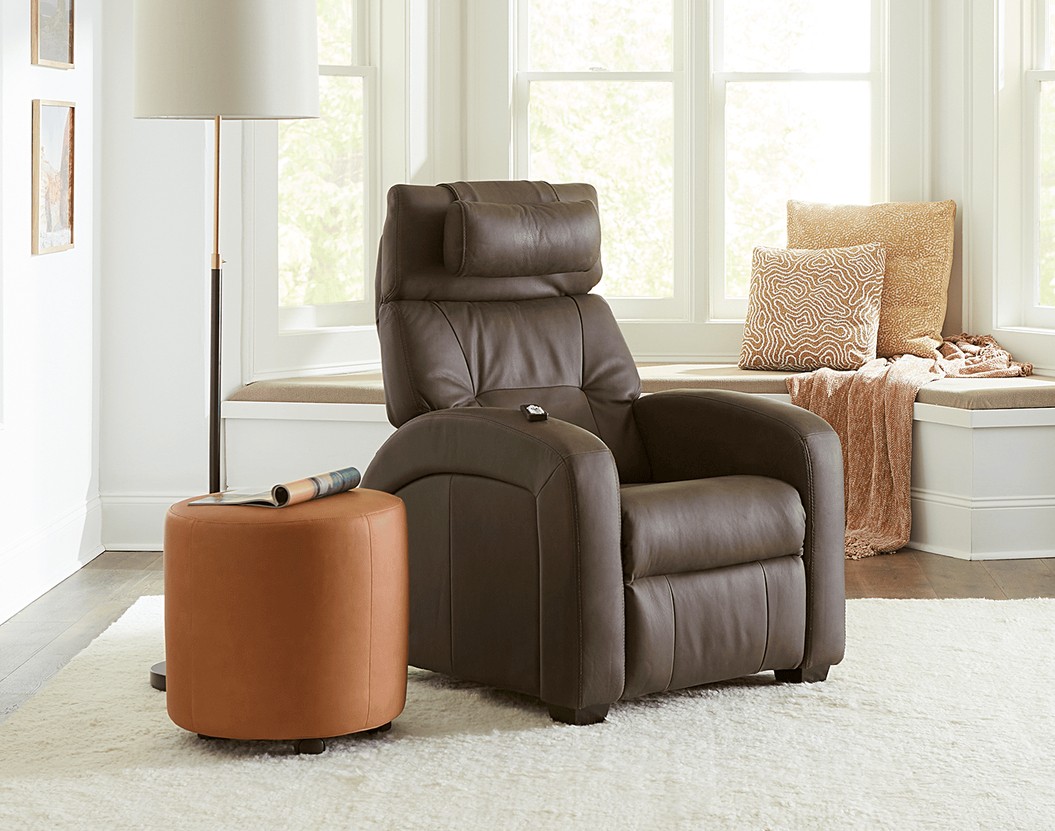 One can experience the amazing zero gravity position at the touch of a button and discover convenient comfort right at home. The ZG5 power recliner allows ease of movement to an upright or reclined position. Fluidly recline to the health-enhancing zero gravity position for reduced stress on the back and increased circulation. For added support, the lumbar back pillow and head pillow can be adjusted to help you find the perfect position for complete relaxation or sleeping. State-of-the-art comfort features, a slim profile accented with back pulls and a brushed chrome leg deliver understated elegance, while also providing you with a sanctuary to help the stress of the day melt away.