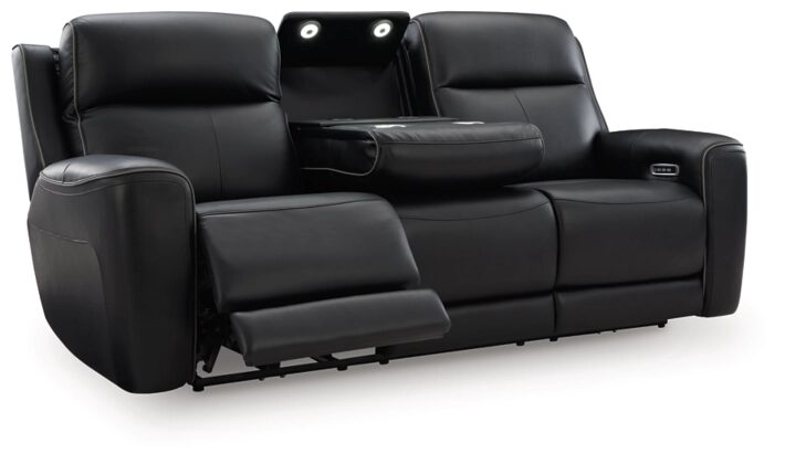 Relax like never before. This power reclining sofa is crafted with luxury in mind, complete with supple top-grain leather in the seating area. With chic tailoring and stylish welting, it creates a sophisticated presence and makes a lasting impression. When you’re ready to be pampered, indulge in the adjustable headrests, heated seats and air massage, all at the touch of a button. And did we mention the sofa’s drop-down table with LED lights and dual cup holders? Chill time just got a whole lot sweeter.