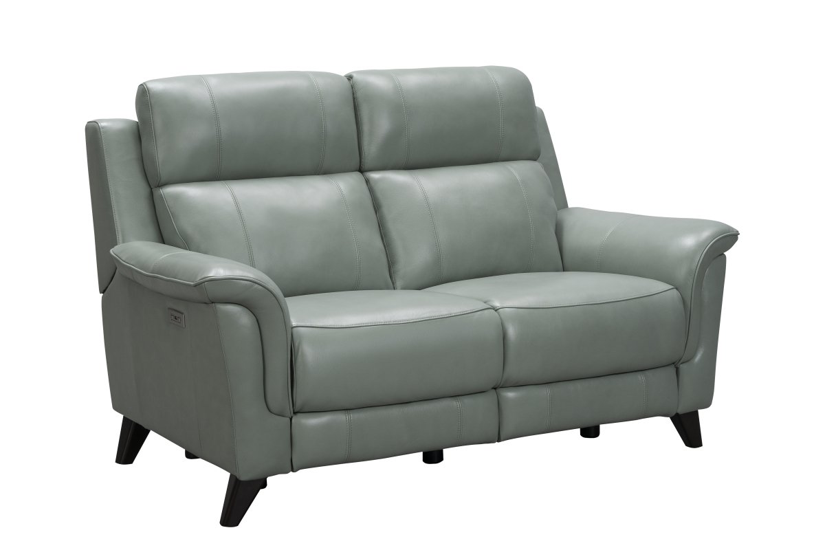 Mid-century modern elevated reclining sofa group with power recline and power headrest. This group features box seat styled pad over chaise seating with pocketed coil springs, tucked pillow arms, and clean line pub backs. Power buttons have USB ports to keep your devices charged. Matching loveseat and recliner available. Legs are finished in a dark teak color.