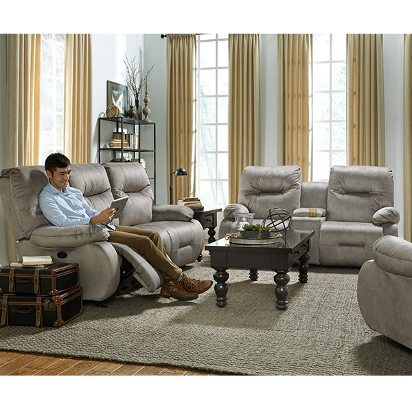 The Brinley reclining collection is loaded with unique features that make this grouping one of the most popular in the furniture industry. The dual-reclining sofa is highlighted by a slight U-shape for a more conversational setting. Baseball stitching amongst all items ensures a secure seam, while offering a decorative accent. Choose from hundreds of fabric and leather options. Extra stuffed pillow arms and backs are filled with premium cushioning fibers and the cooler, extra durable cushioned chaise lounges featuring Performa-Weave® technology are designed for inviting comfort. Saving the best for last is the Power Tilt Headrest option offering comfort and support needed most when reading or watching television. This option also includes a USB charging port on both sides of the sofa or loveseat. The reclining loveseat is available in a wide range of choices including a storage console, rocking bases and easy-recline handle in lieu of the power button. The Brinley recliner allows you to customize the base to your preferred motion.