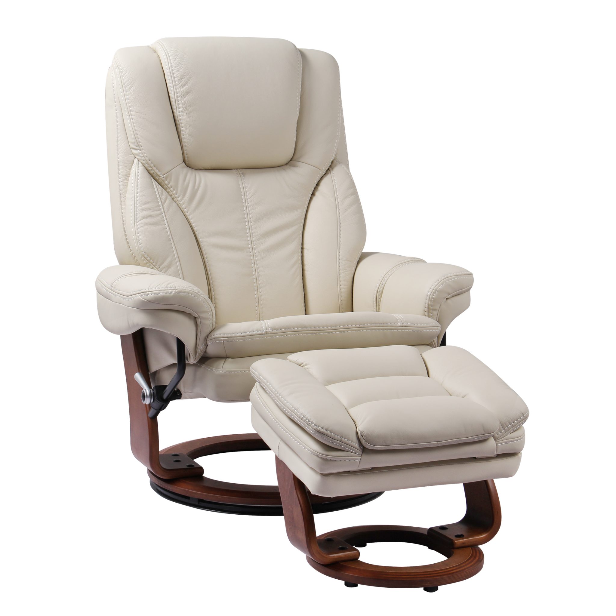 Experience luxury comfort with this reclining chair and ottoman group. The Scandinavian style chair easily pushes back to recline, and features a contemporary wood base in a Chestnut finish. Pillow arms and plush padding on the seat, back, and ottoman complete the comfortable look and feel, while hidden storage in the ottoman showcases smart function.